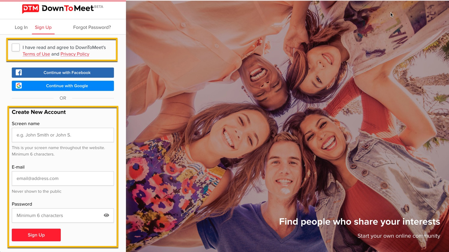 Welcome to DownToMeet. Here’s how to sign up and create your account.