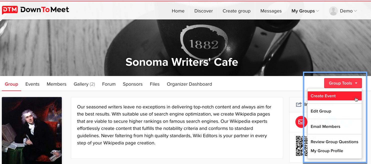 When you have created your group, you are ready to create an event. Select the group from the My Groups menu and click Create Event.