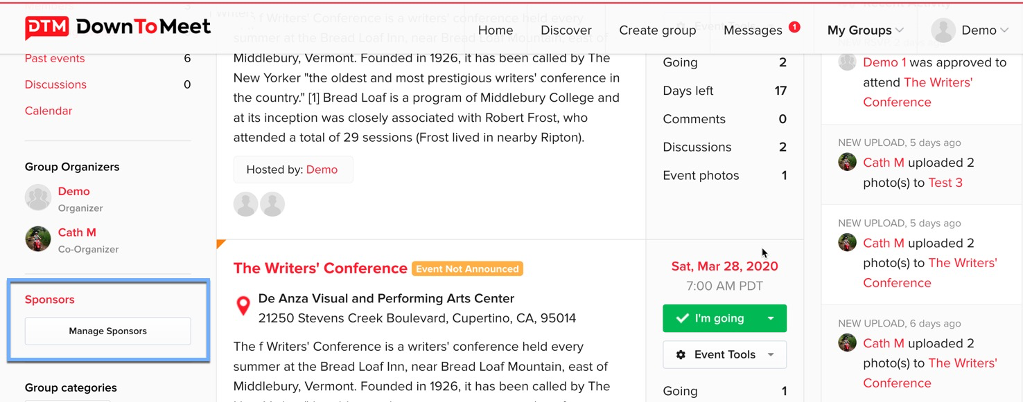 Sponsorship can generate income for the group if the sponsor is willing to pay for the advertising. DownToMeet can manage the sponsor details although it does not manage any payments.
