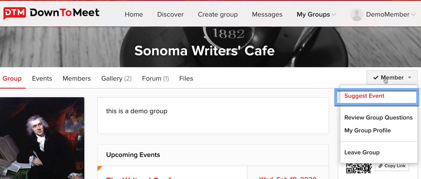 When you are in the Group, go to the Member dropdown and select Suggest Event.