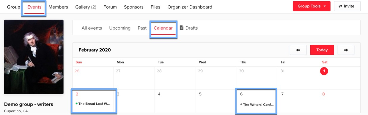 The Group page view allows you to see all past and future events related to the group. From the Group page, select Events, then Calendar.